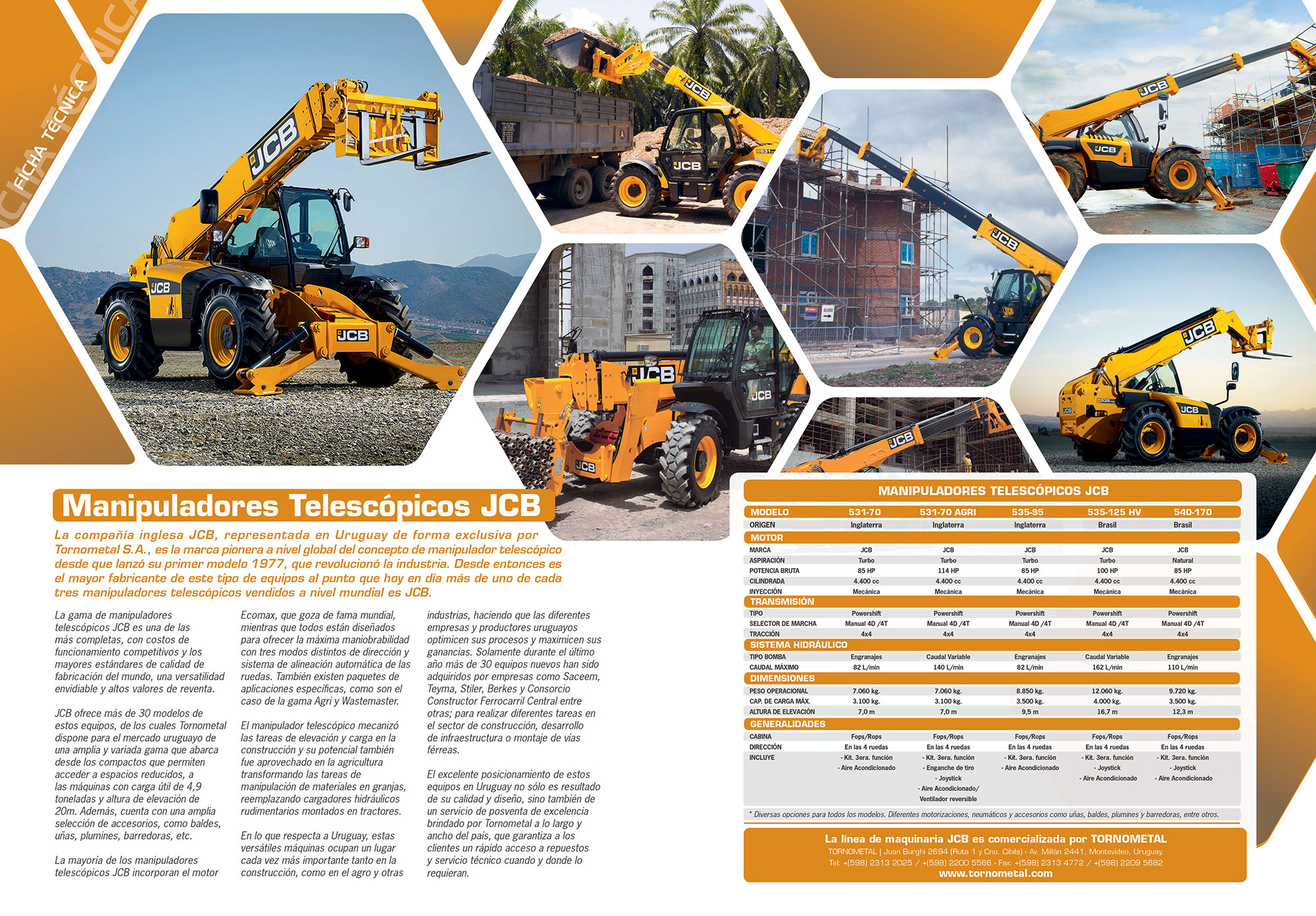 La compañía inglesa JCB, representada en Uruguay de forma exclusiva por La compañía inglesa JCB, representada en Uruguay de forma exclusiva por Tornometal S.A., es la marca pionera a nivel global del concepto de manipulador telescópico desde que lanzó su primer modelo 1977, que revolucionó la industria. Desde entonces es el mayor fabricante de este tipo de equipos al punto que hoy en día más de uno de cada tres manipuladores telescópicos vendidos a nivel mundial es JCB.